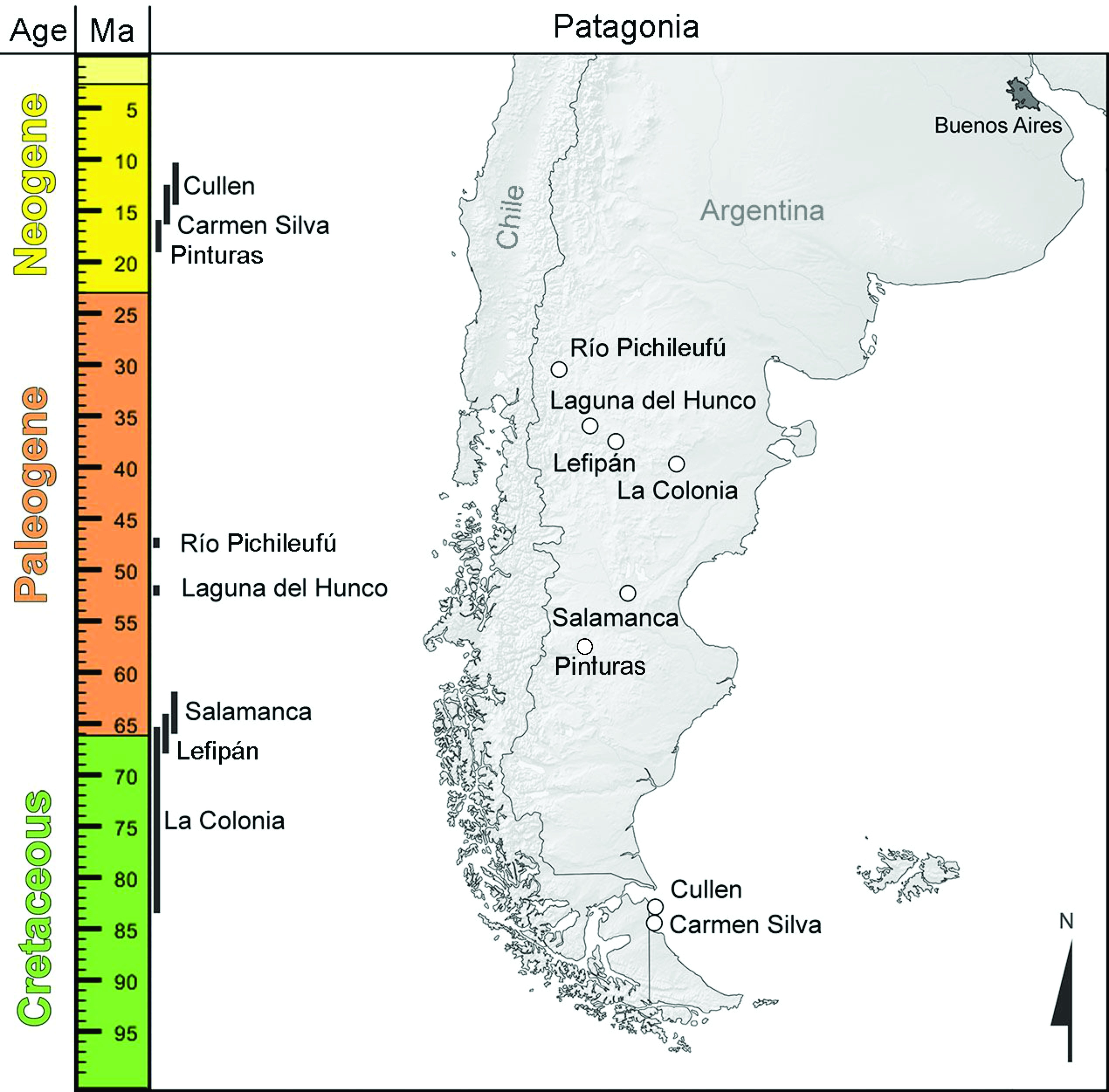 The Laguna del Hunco paleobiota is preserved in multiple fossil localities found in the Tufolitas Laguna del Hunco of northwestern Chubut Province, Argentina. The biota consists of a diverse assemblage of fossil plants, insects, and vertebrates preserved in sediments that were deposited in an ancient lake situated in a volcanic caldera. The flora is estimated to be about 52 million years old, or early Eocene in age, based on radioisotopic dating of volcanic sediments associated with the fossil deposits.
